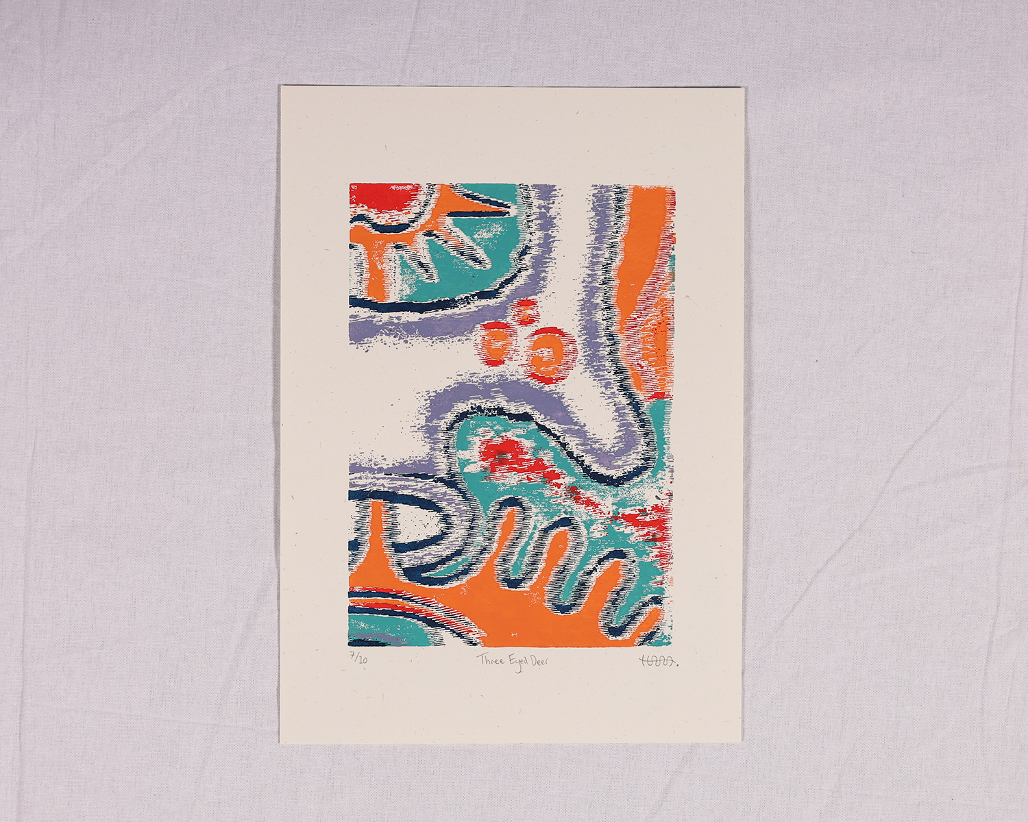 ‘Three Eyed Deer’ delves deep into an illustration from Murdoch’s archive, reproducing a tightly cropped section of his original work. The raw curves, curls, swirls and pokedots archetypal of Harry’s style are given new life by layering five laser-cut woodblock prints, creating a buzzing physical texture that sends the composition into constant motion! With a bouncy colour palette to match, this tactile print is overflowing with energy.